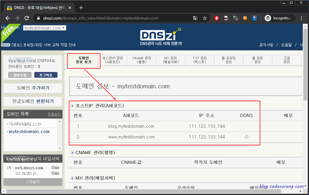 아래 그림의 의예에서 blog.mytestdomain.com과 www.mytestdomain.com 두 개의 도메인이 등록되어 있으나, www.mytestdomain.com만 DDNS로 설정되어 있는 것을 볼 수 있다.