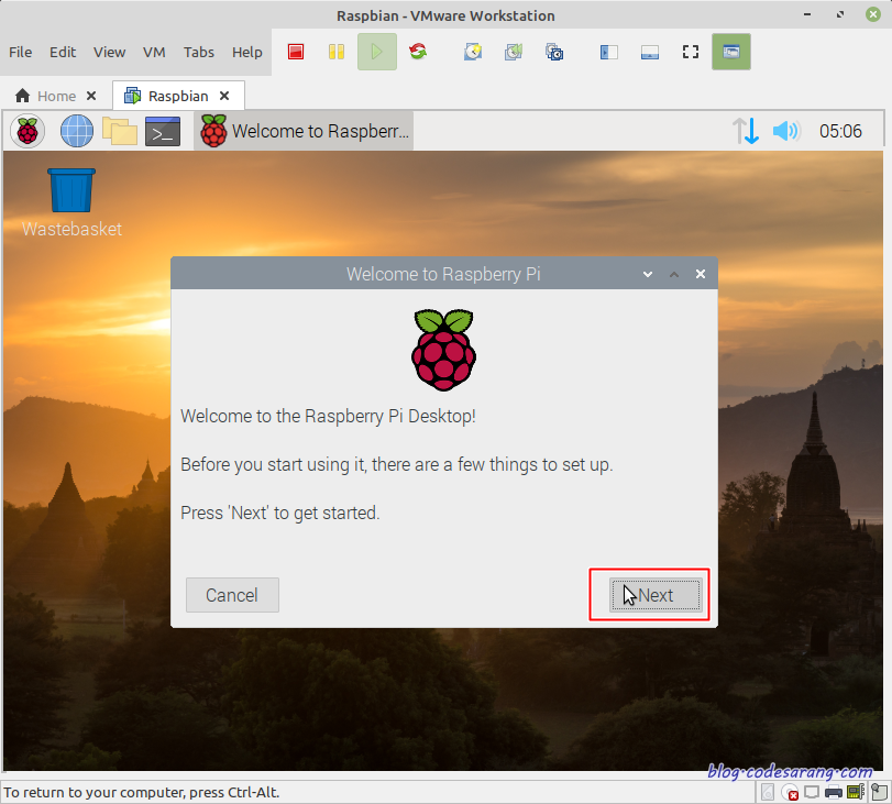 최초 부팅이 완료 되었다. 여기서 "Next" 버튼을 누른다.