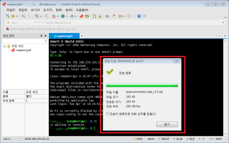 이제 SSH 클라이언트를 이용, 라즈베리파이에 접속한다. putty의 경우 파일 전송 기능이 없으므로 여기서는 XShell로 접속할 것을 추천한다.