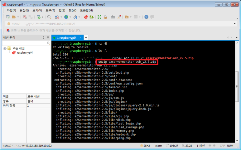 Xshell로 다운받은 파일을 라즈베리파이에 업로드 한 이후, unzip 명령어를 이용하여 파일을 압축 해지한다.