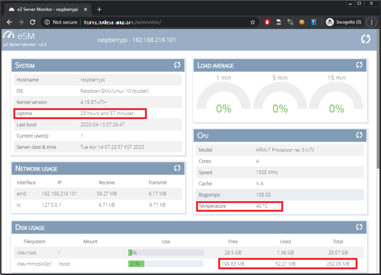 이제 모든 준비가 완료되었다. 라즈베리파이 웹서버에 접속하면 아래와 같이 시스템 상태를 모니터링 할 수 있는 화면을 볼 수 있다.