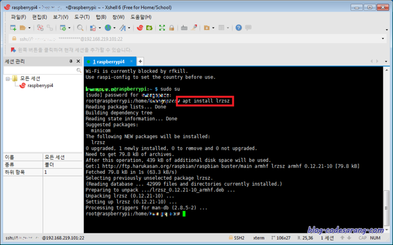 "sudo su" 명령을 이용하여 root 권한으로 이동후 "lrzsz" 패키지를 설치한다.