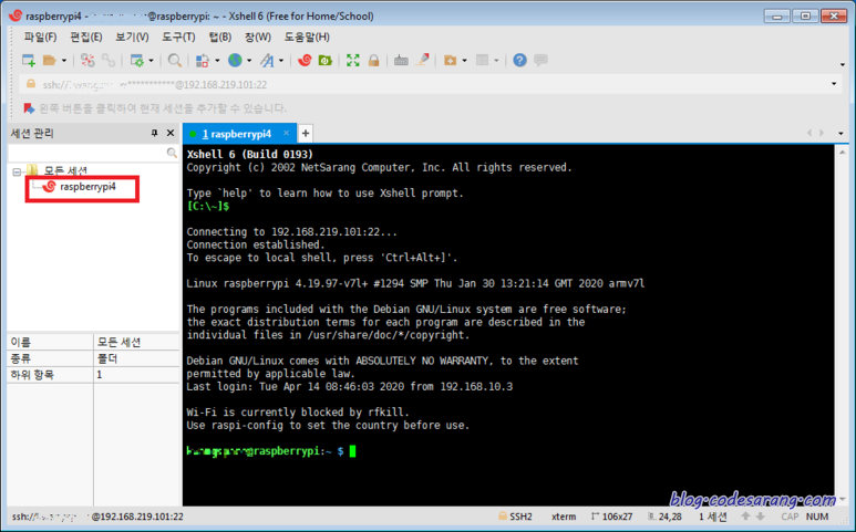 이제 XSHELL을 이용하여 라즈베리파이에 접속한 화면이다. 다음부터는 왼쪽의 "raspberrypi4"로 저장된 세션을 더블클릭하기만 하면 자동 접속된다.​