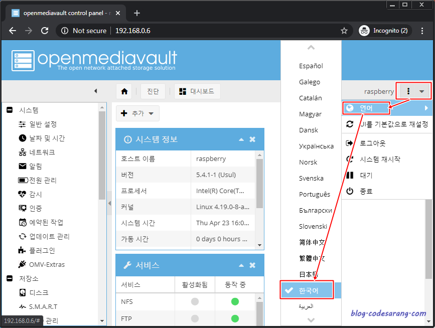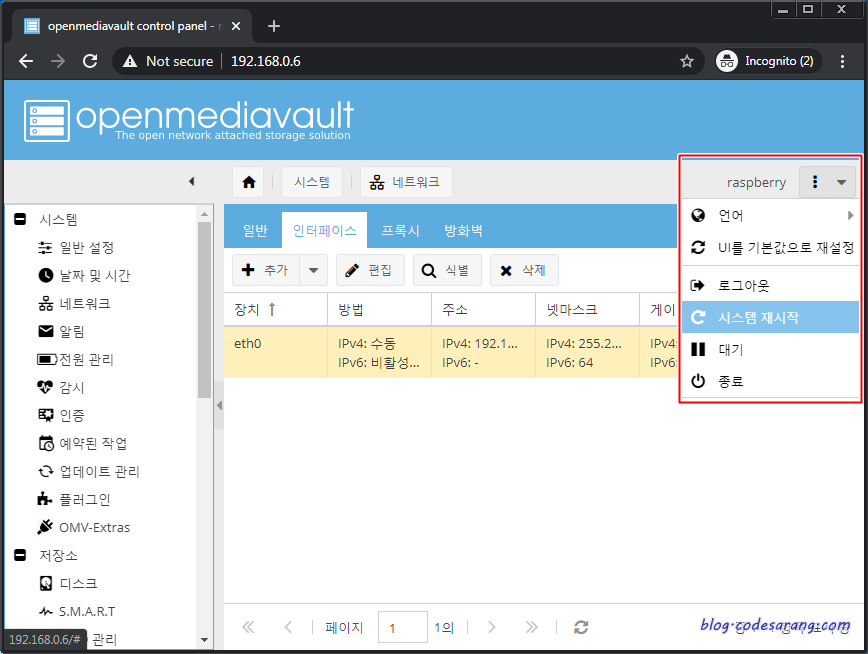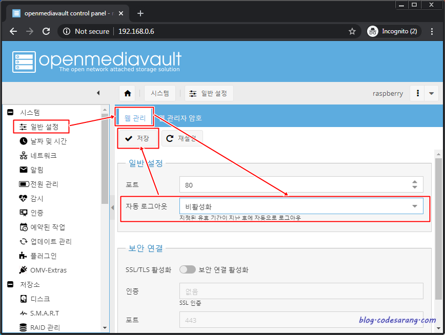 OMV 설치 이후 제일 처음 할 일은 로그아웃 설정 및 관리자 비밀번호 변경이다.