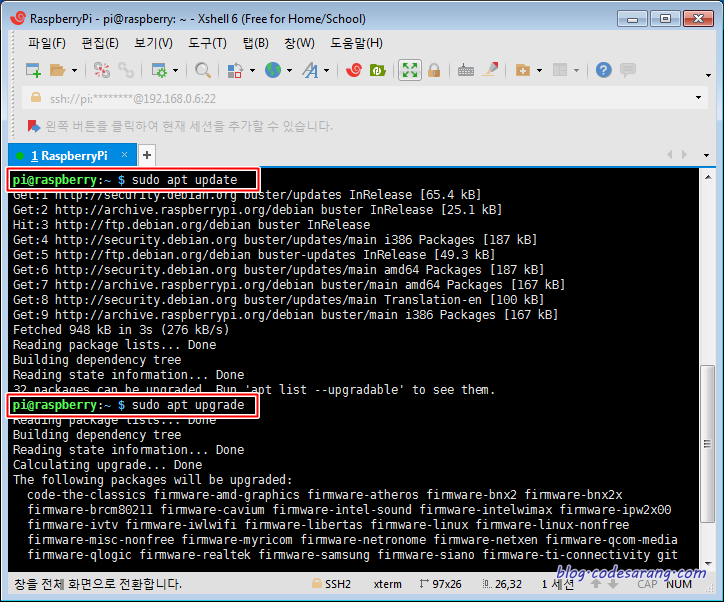 이제 아래 명령을 이용하여 라즈비안 운영체제를 최신 상태로 업데이트 한다.