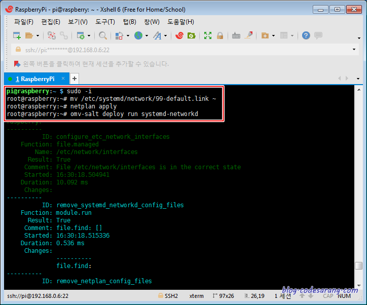 최초 로그인 이후 반드시 ①비밀번호 변경 및 ②ssh 그룹에 pi 사용자 계정 추가 과정을 거쳐야 한다.