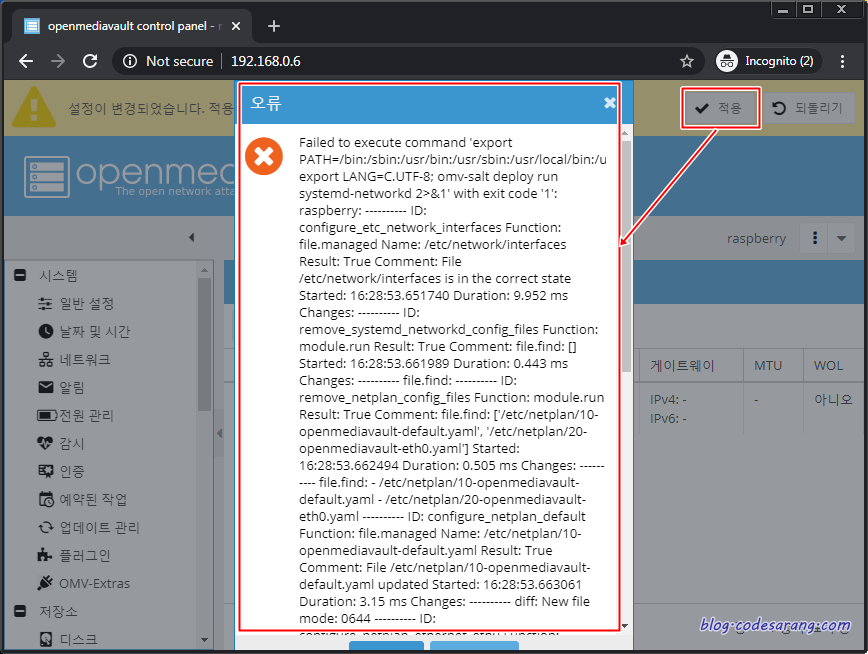 저장후 적용 버튼을 누르면 한참 무언가를 하다가 아래와 같은 오류를 뱉어내는 경우가 있다.