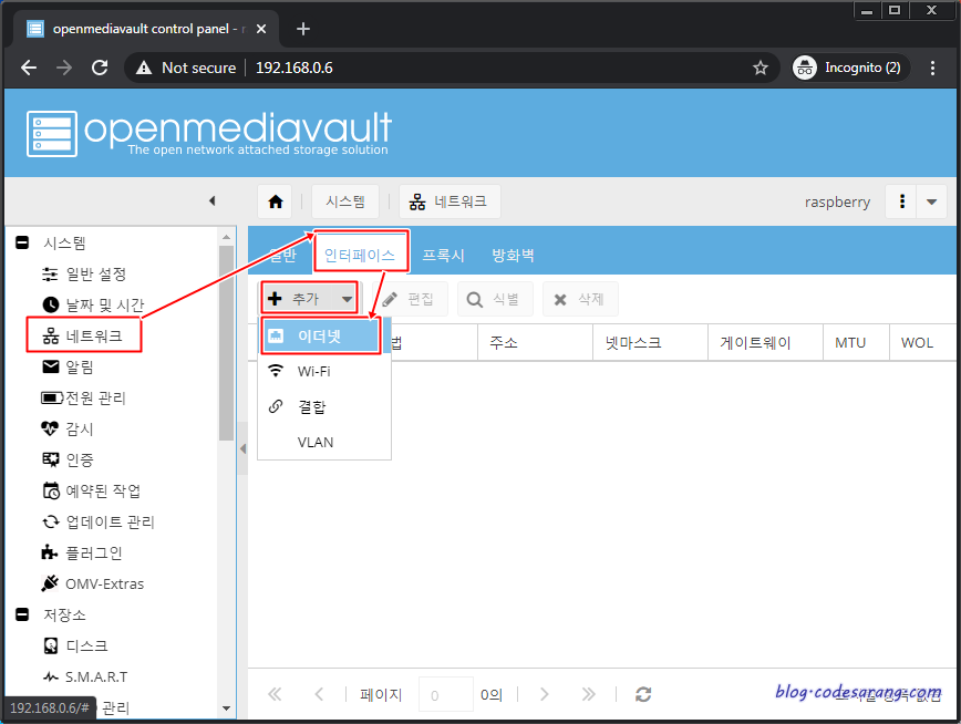 "네트워크"->"인터페이스" 메뉴를 선택하고 "추가" 버튼 클릭 후 "이더넷" 메뉴를 클릭한다.