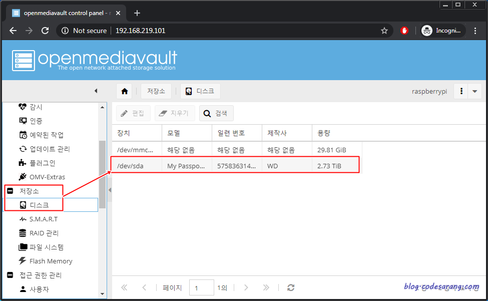 라즈베리파이에 외장 USB HDD를 연결하고 OMV 관리 페이지의 "디스크" 메뉴를 선택하면 아래 그림처럼 연결된 HDD가 보인다. 여기서는 "/dev/sda"로 나타난다.