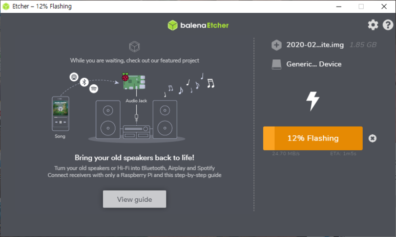이미지 쓰기가 완료되었다면, "X" 버튼을 눌러 Etcher 프로그램을 종료한다.