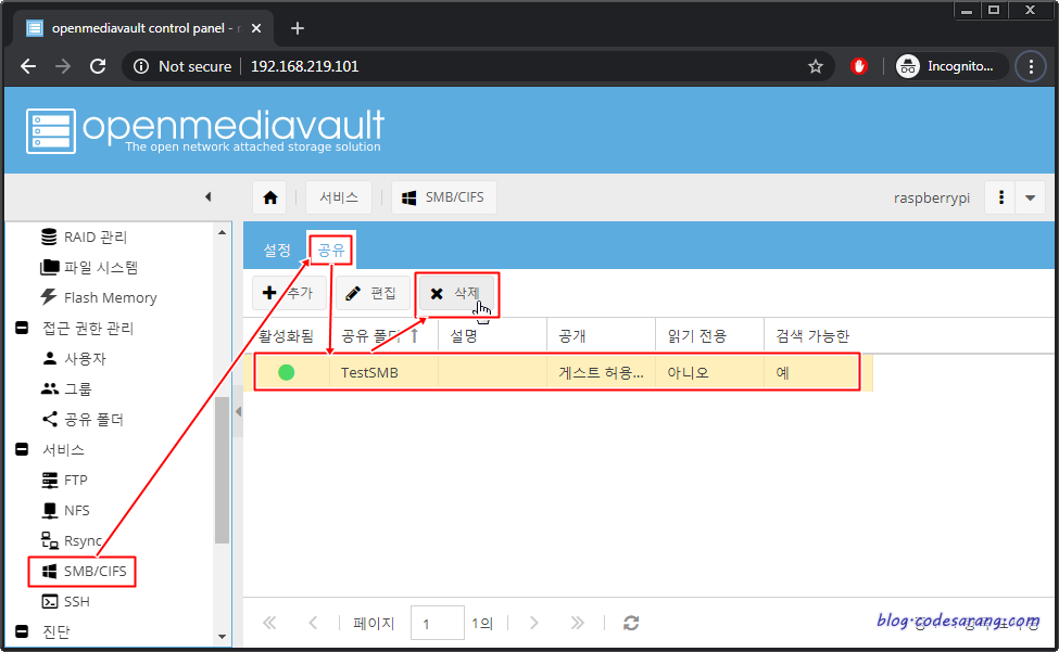 왼쪽 "SMB/CIFS" 메뉴를 선택하고 "공유" 탭 선택후 공유 폴더(여기서는 TestSMB) 선택, 그리고 "삭제" 버튼을 클릭한다.
