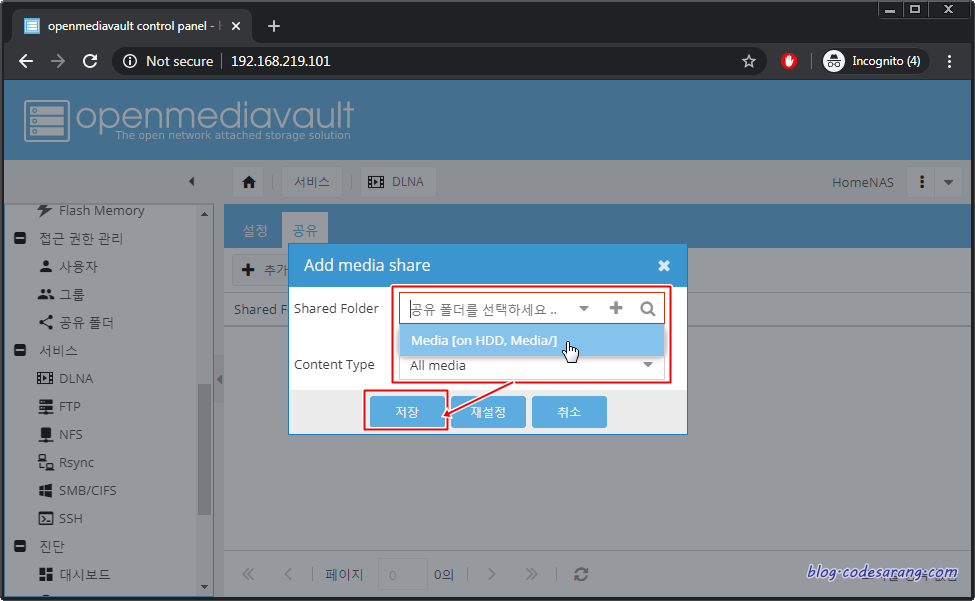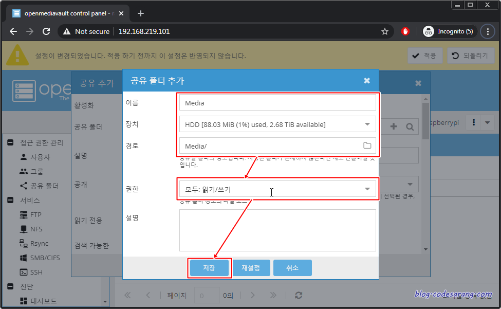 공유 폴더 이름(여기서는 Media)과 HDD 장치 등을 선택하고 권한은 "모두: 읽기/쓰기"를 선택한 후 "저장" 버튼을 누른다.