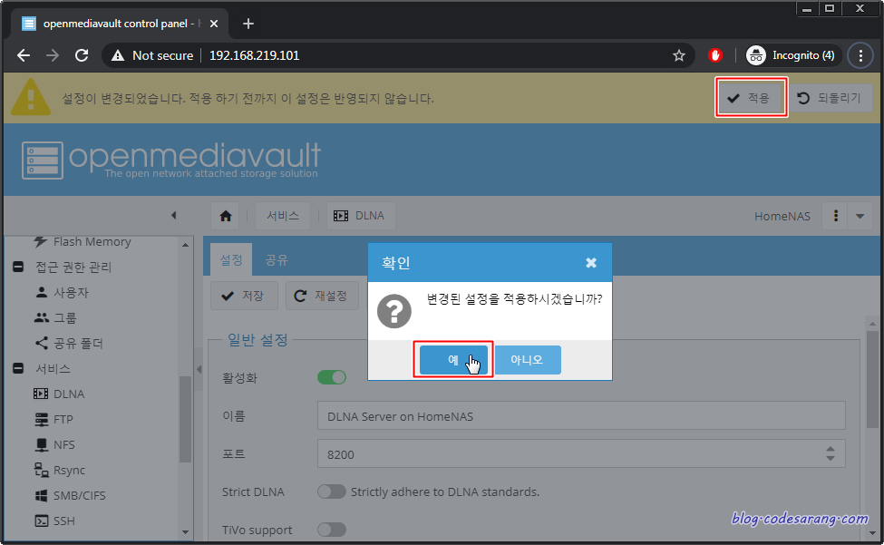 DLNA 서버 설치가 완료되면 아래처럼 "서비스" 메뉴 아래 "DLNA" 메뉴가 새롭게 생긴다.