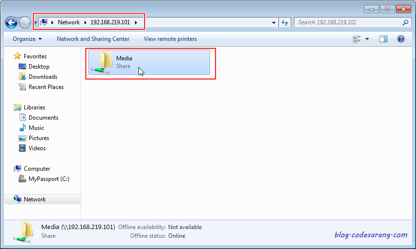 이제 SMB를 통해 공유 폴더에 접근할 수 있다. 윈도우 탐색기에서 라즈베리파이에 직접 접근해 보면 아래와 같이 "Media"라는 공유 폴더가 생긴것을 볼 수 있다.(나의 경우는 "\\192.168.219.101")