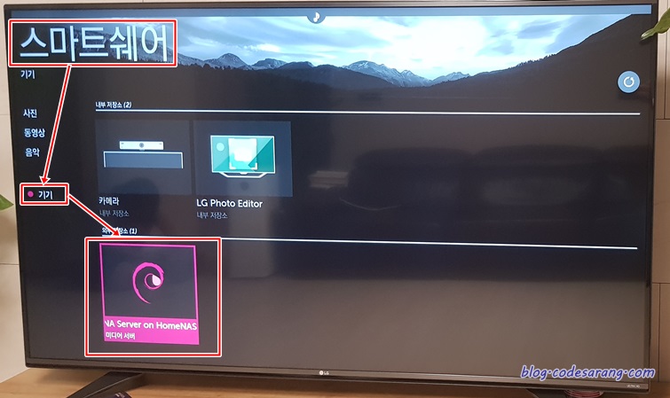 나의 경우 LG 스마트 TV여서 "스마트쉐어" 앱을 실행시켰다. 그리고 "기기"를 검색하면 아래처럼 OMV에서 설정한 미디어 서버가 검색된 것을 볼 수 있다.