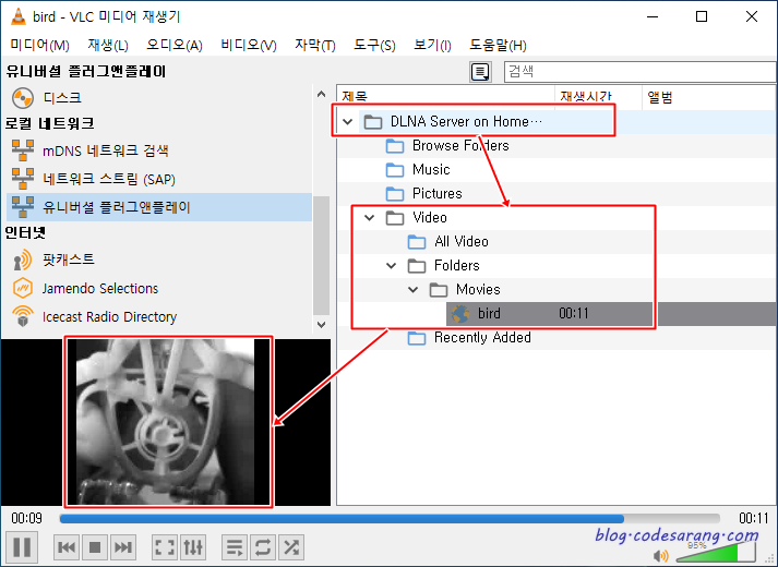 DLNA 서버를 선택하고 폴더를 찾아 들어가면 업로드된 동영상 확인 및 재생이 가능하다.