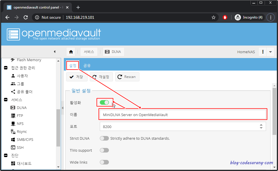 이제 "설정" 탭으로 가서 DLNA 이름 설정 후 활성화를 시키고 "저장" 버튼 클릭.