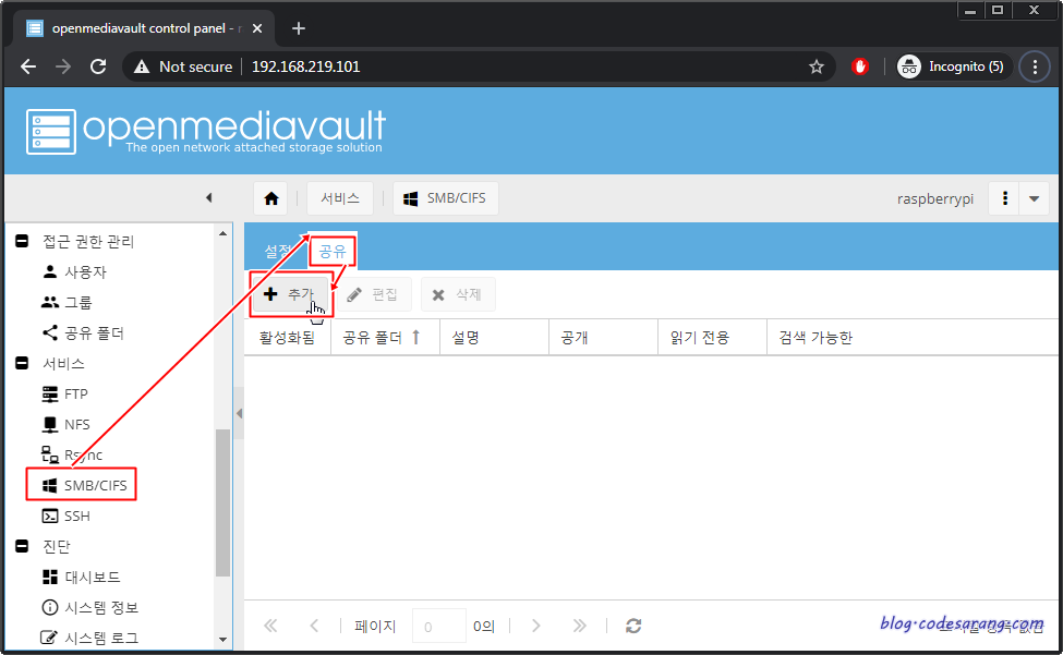우선 OMV에 접속, 관리자로 로그인한 후 "서비스" 메뉴 하단 "SMB/CIFS" 메뉴을 선택하고 "공유" 탭을 클릭한다.