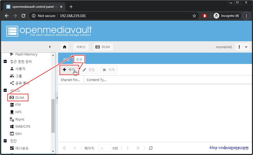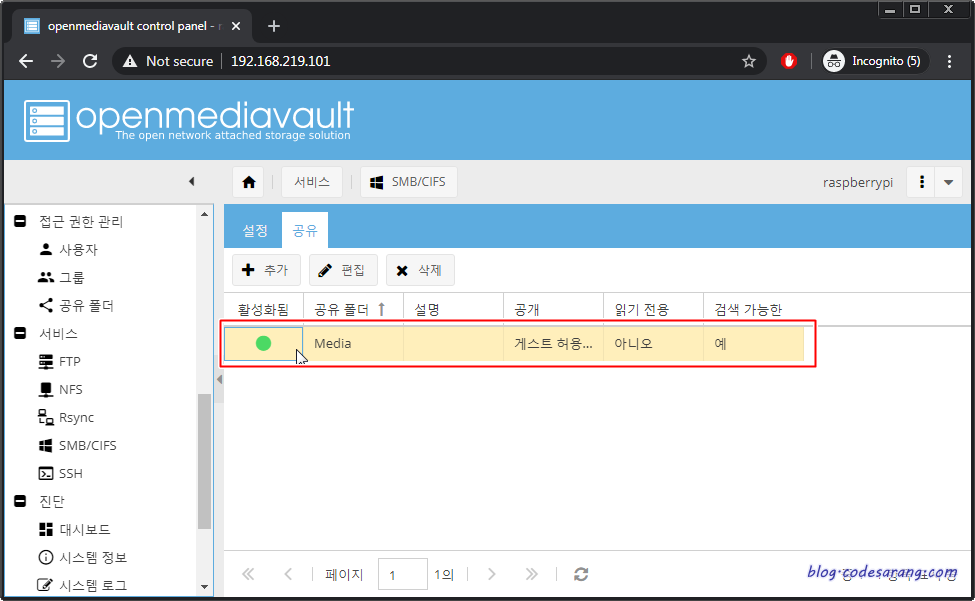 우선 OMV에 접속, 관리자로 로그인한 후 "서비스" 메뉴 하단 "SMB/CIFS" 메뉴을 선택하고 "공유" 탭을 클릭한다.