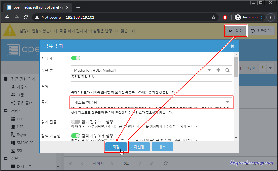 이제 "공유 추가" 윈도우에 "공유 폴더"가 지정되었다. 이제, 공개 여부를 "게스트 허용됨"을 선택하고 "저장" 및 "적용" 버튼을 클릭한다.
