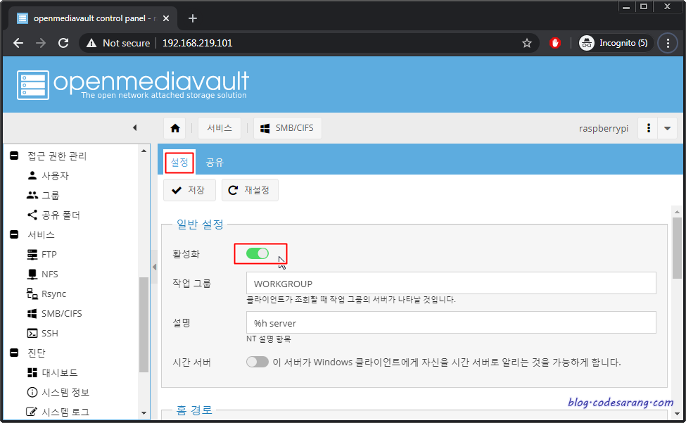 OMV에서 SMB 설정 방법에 대해 이미 언급한 바 있으나, 다시한번 간단히 설명하도록 하겠다.