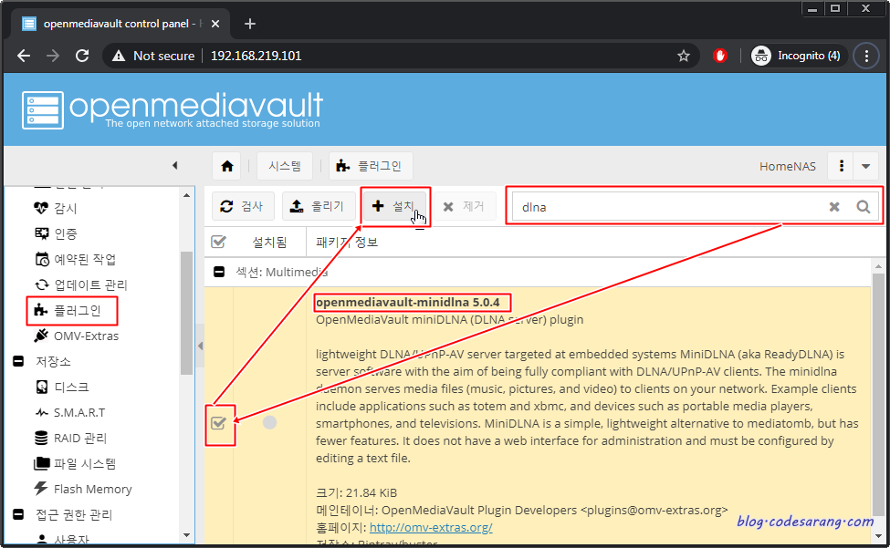 그리고 "dlna"를 입력 후 검색하면 아래처럼 "openmediavault-minidlna" 플러그인이 검색된다.