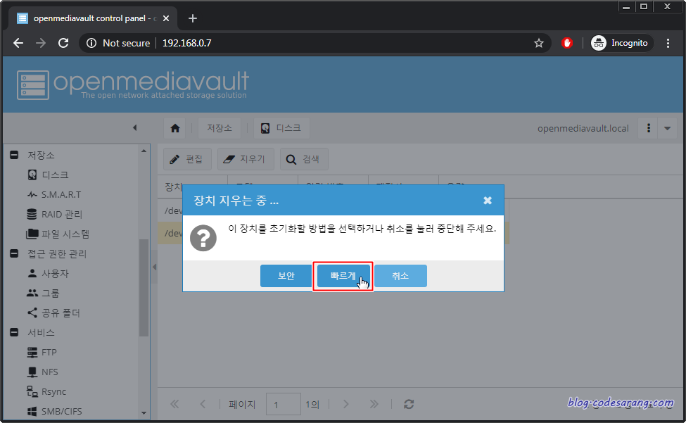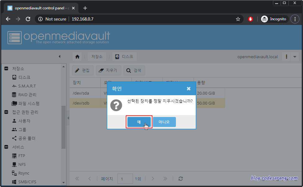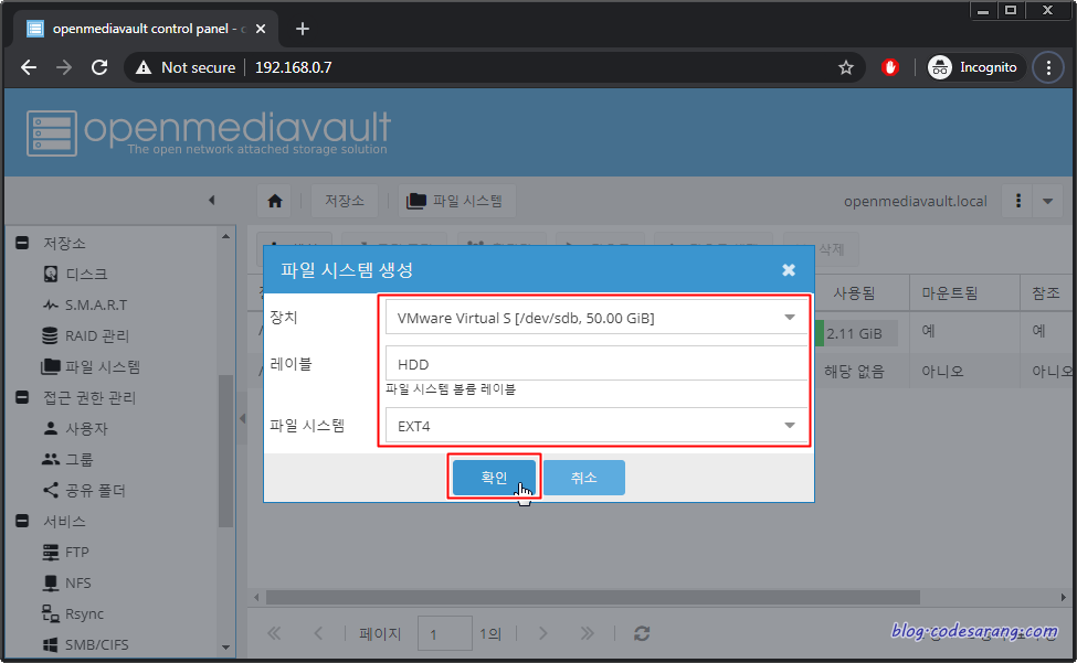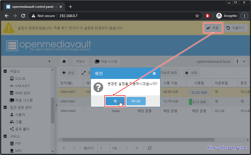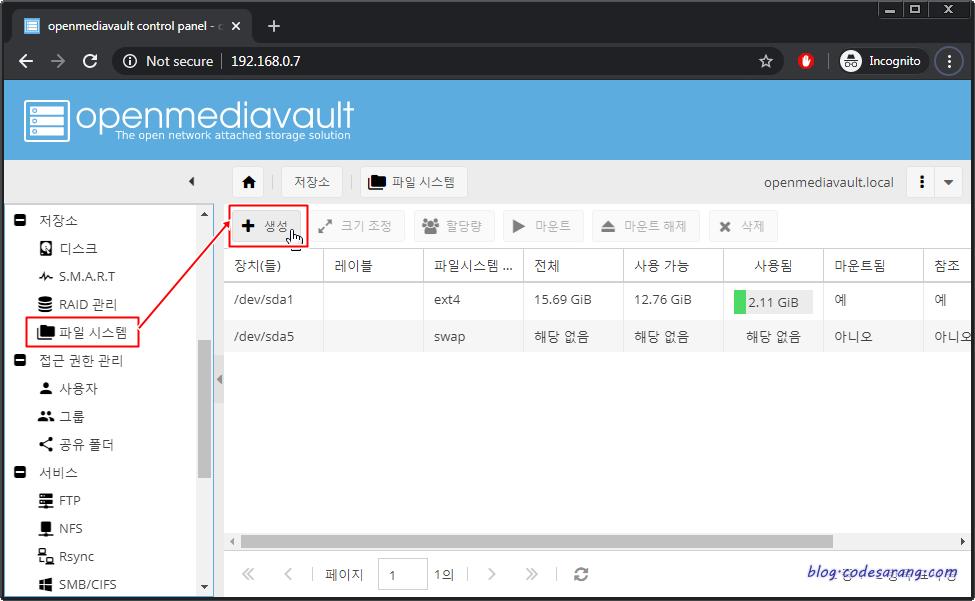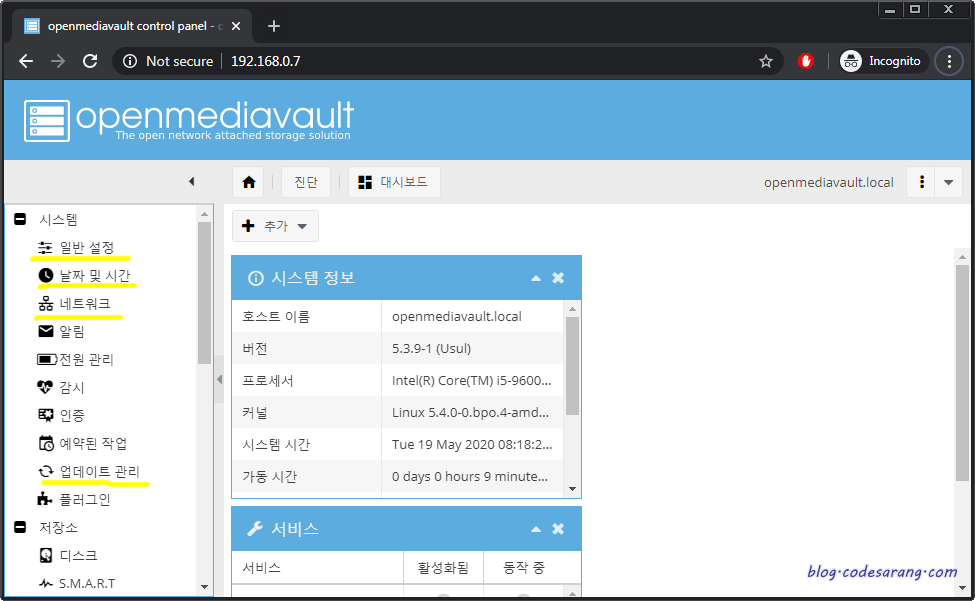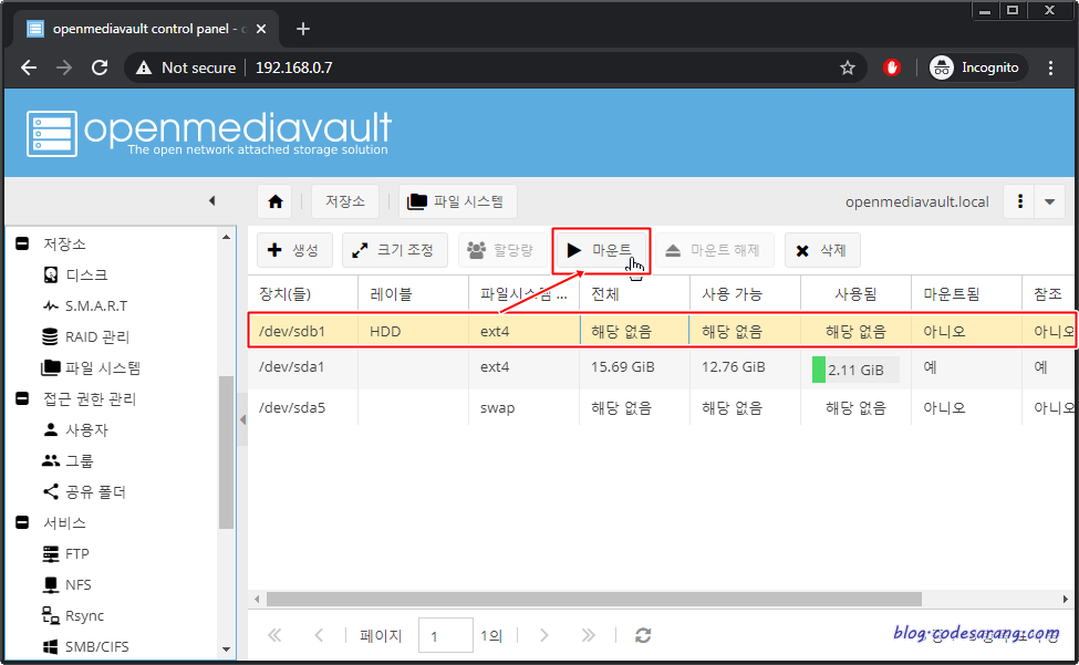 OMV 설치후 필요한 환경 설정에 대해서는 OMV 설치 포스팅에서 이미 언급한 바 있다. https://blog.codesarang.com/17 라즈베리파이4에 OMV5 (OpenMediaVault 5) 설치 및 문제 해결 OpenMediaVault(이하 OMV) 버전..