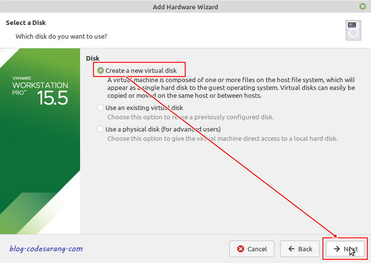 여기서 "Create a new virtual disk"를 선택하고 Next