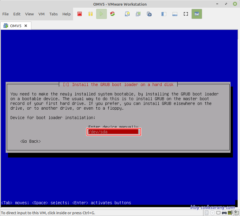 GRUB 부트로더 설치위치를 선택하는 화면이다. "/dev/sda"를 선택한다.