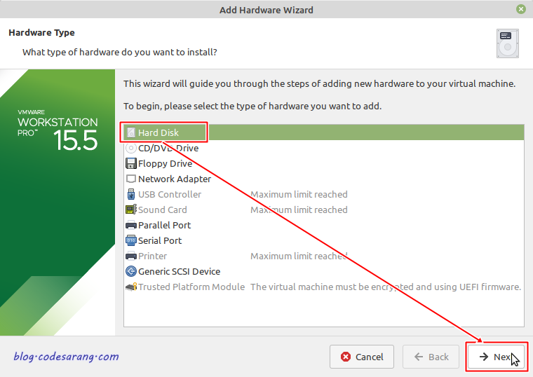 "Hard Disk" 선택 후 "Next" 버튼 클릭.