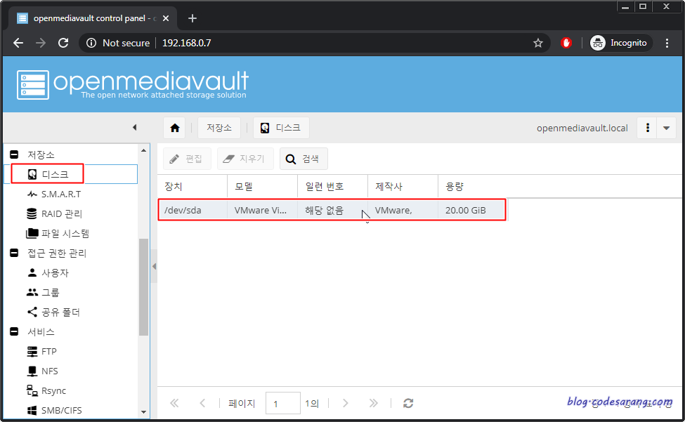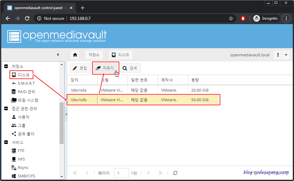 OMV 관리 페이지에 접속한 후 "디스크" 메뉴를 선택하면 아래처럼 "/dev/sdb"가 보인다. 해당 디스크를 선택하고 "지우기" 버튼을 클릭해 준다.