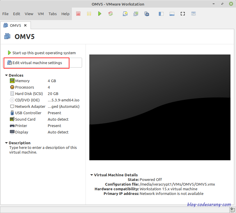 VMware의 OMV5 초기 화면에서 "Edit virtual machine settings"를 클릭한다.