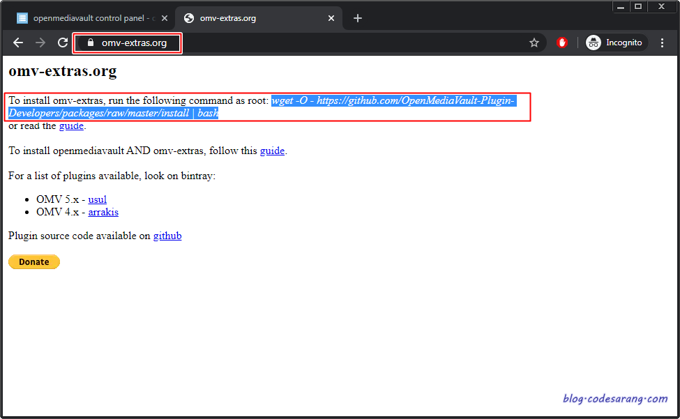 https://omv-extras.org/ 사이트를 방문하면 아래 그림처럼 OMV-Extras 설치를 위한 쉘 스크립트를 제공한다.