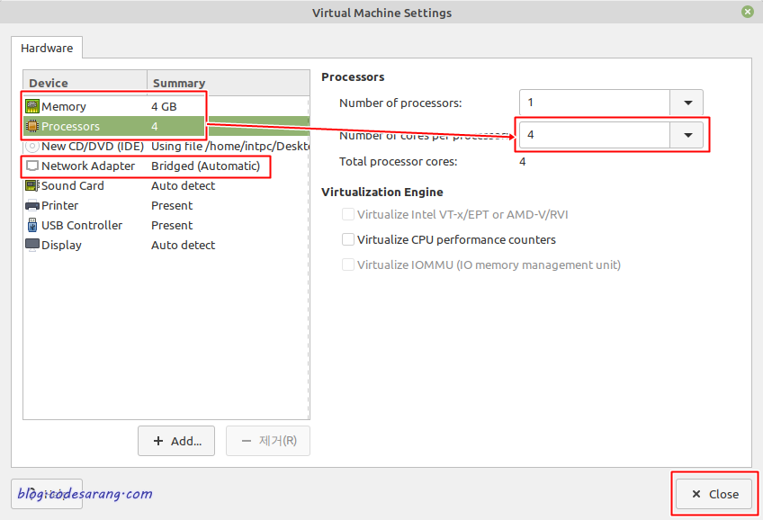 메모리(RAM) 용량, 포르세스 개수, 네트워크 어뎁터 형태(Bridge 모드)를 수정한 후 "Close" 버튼을 클릭한다.