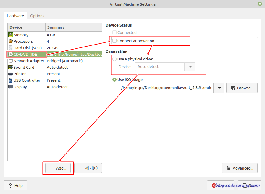 더이상 OMV ISO이미지는 필요 없으므로, "CD/DVD"를 선택하고 연결을 해지한다.(Connect at power on 체크박스 해지"