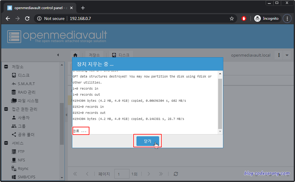완료 메시지가 나오면 "닫기" 버튼을 클릭한다.