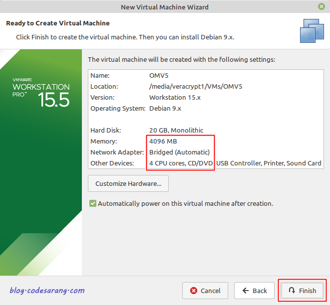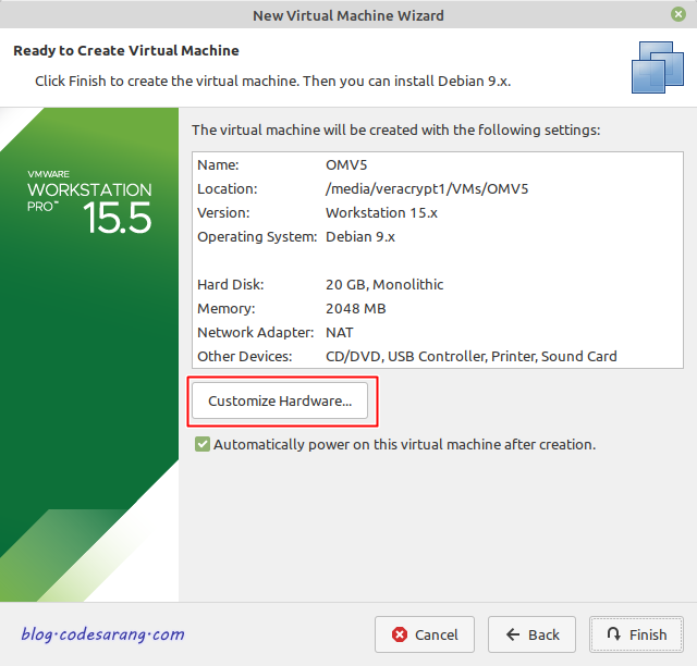 이제 거의 완료 되었다. Virtual Machine을 생성하기 전에 "Customize Hardware..." 버튼을 클릭한다.