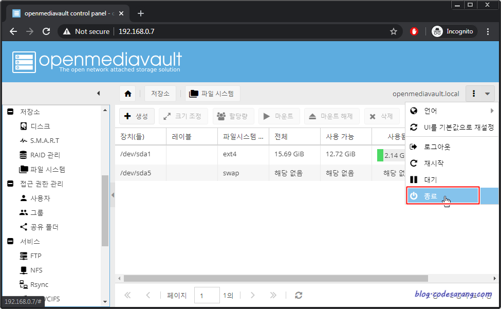 OMV 설치후 필요한 환경 설정에 대해서는 OMV 설치 포스팅에서 이미 언급한 바 있다. https://blog.codesarang.com/17 라즈베리파이4에 OMV5 (OpenMediaVault 5) 설치 및 문제 해결 OpenMediaVault(이하 OMV) 버전..