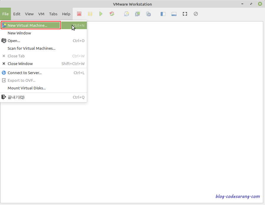 VMware Workstation 버전을 실행한 후 아래처럼 "File"-"New Virtual Machine..." 메뉴를 클릭한다.
