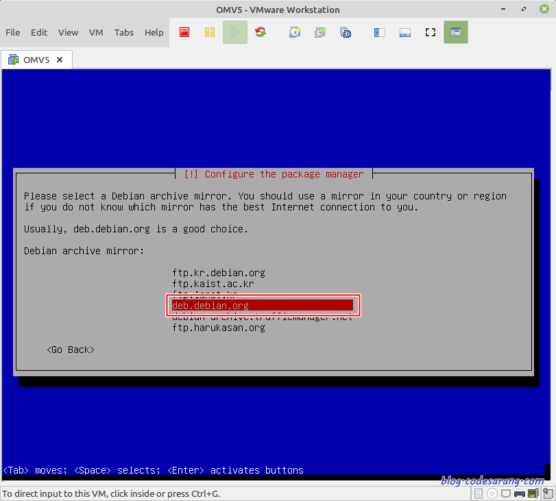 어떤거를 선택해도 무방하니, 디폴트인 "deb.debian.org"를 선택하고 Enter키를 입력한다.