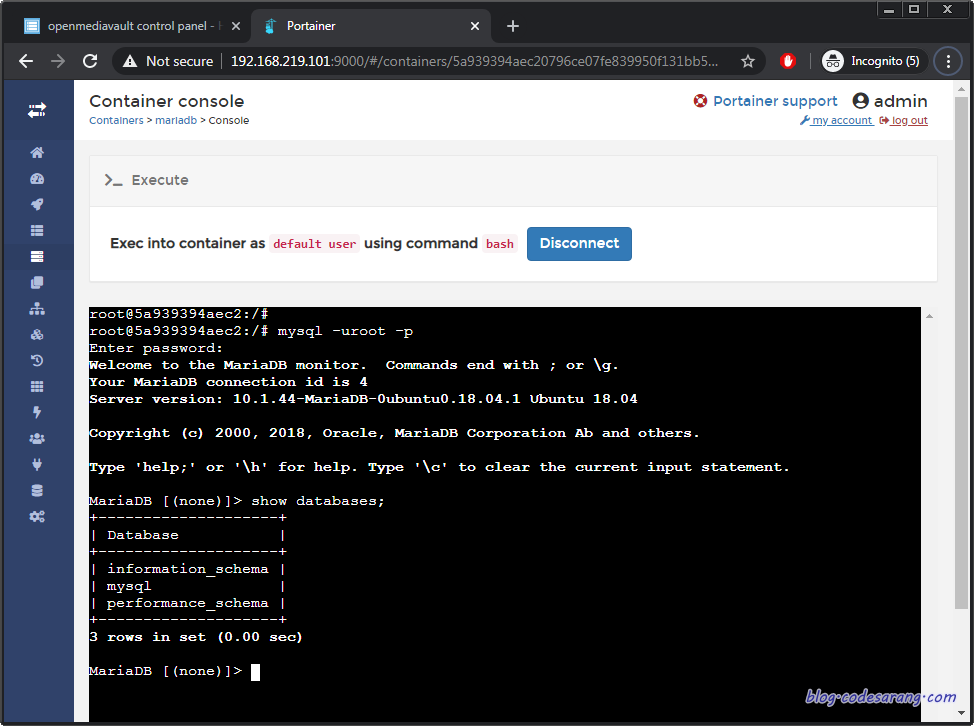 아래처럼 웹 환경에서 mariadb docker의 쉘로 접근이 가능하고, 내리는 것도 가능하다.