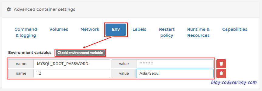 "Env" 탭을 선택해 "add environment variable" 버튼을 클릭한 후, MySQL root 비밀번호와 타임존에 대한 환경 변수를 설정해 준다.