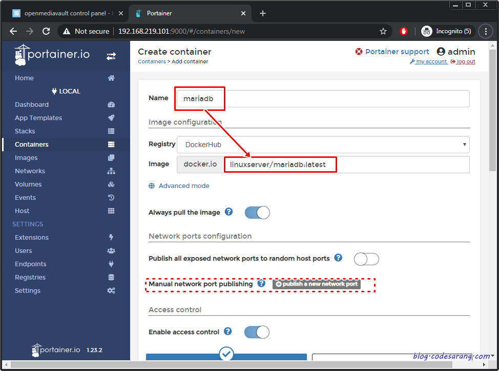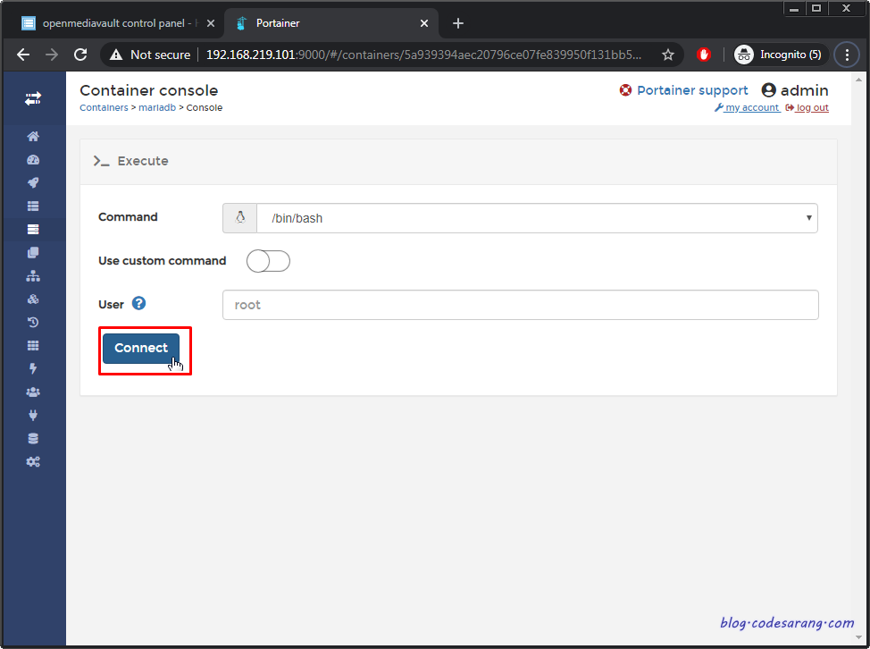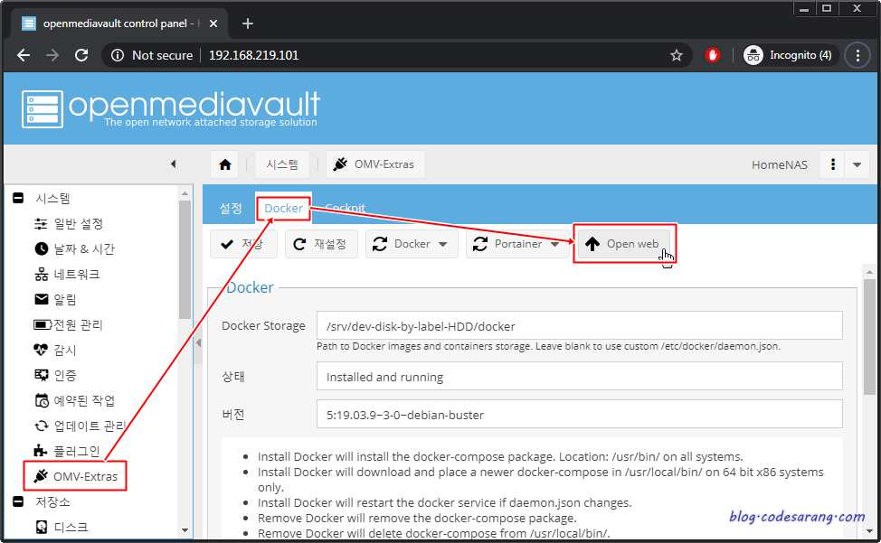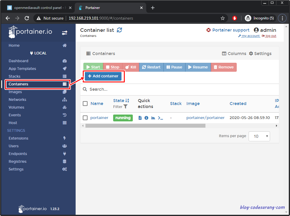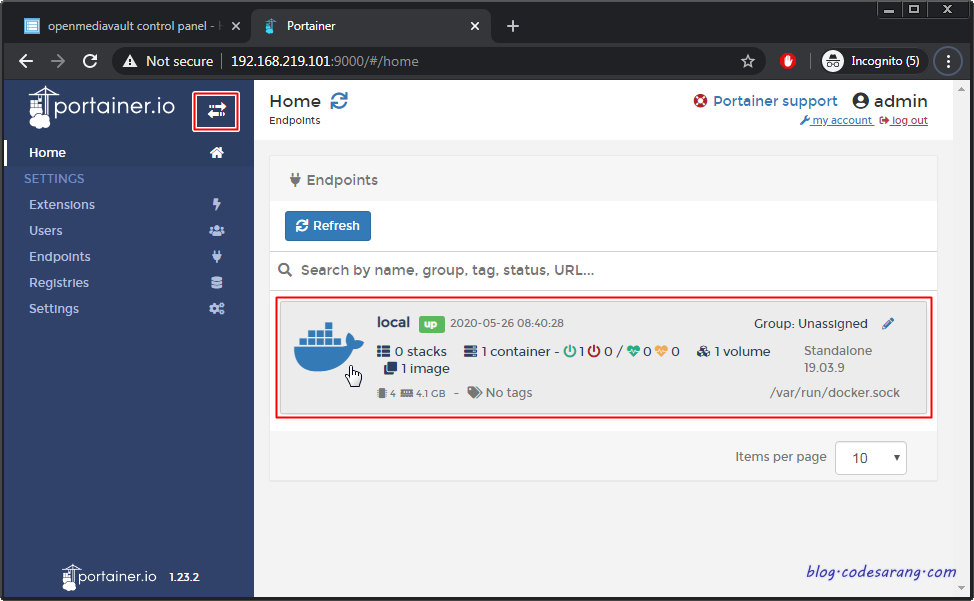 우선 OMV에 설치되어 있는 Portainer라는 웹 기반 도커 UI 툴을 실행한다.