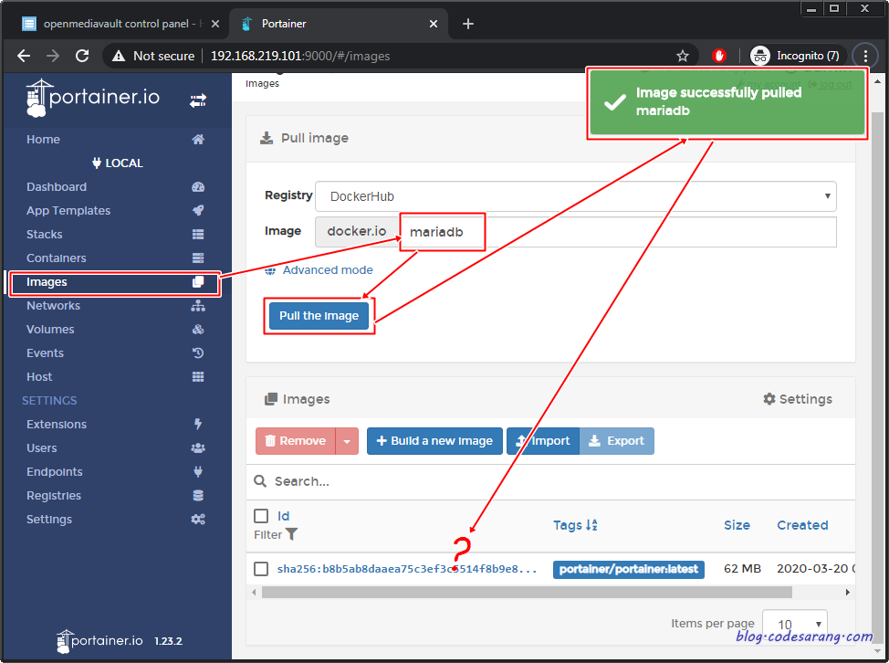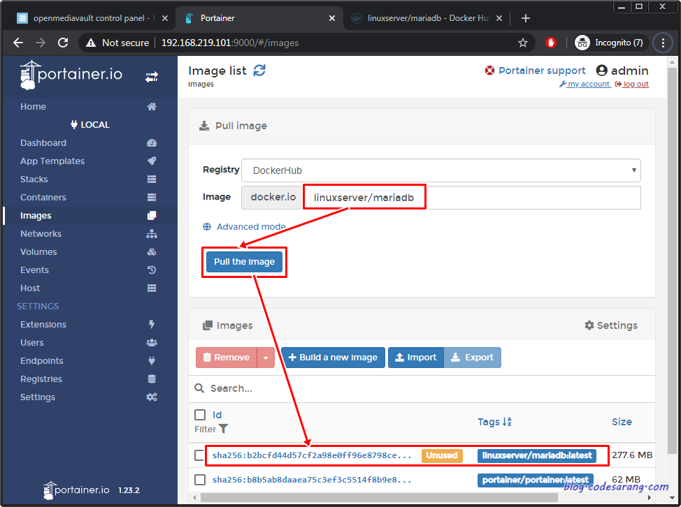 다시 돌아가 "linuxserver/mariadb" 입력후 "Pull the image" 버튼을 클릭하면 잠시뒤에 이미지 리스트에 mariadb 이미지가 새로 생성된다.