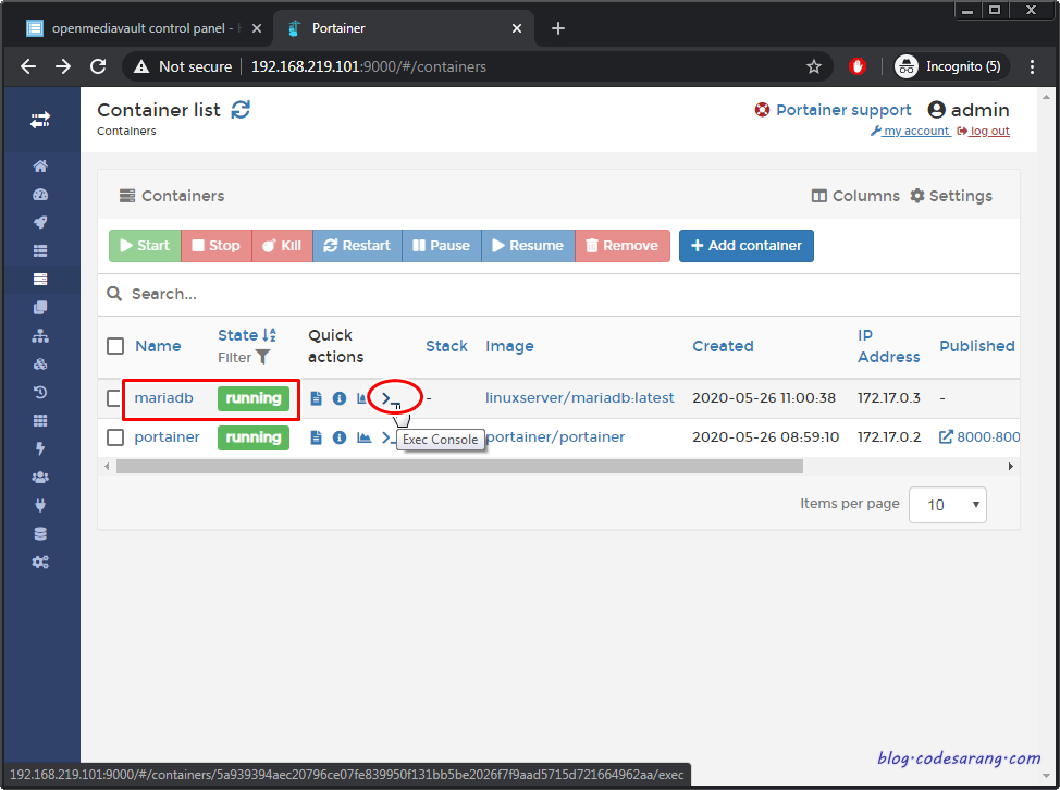 하나더, 빨간 동그라미를 보면 콘솔 버튼이 있다. 이 콘솔은 mariadb가 설치되어 있는 컨테이너 접근을 위한 쉘 인터페이스 환경을 제공한다.