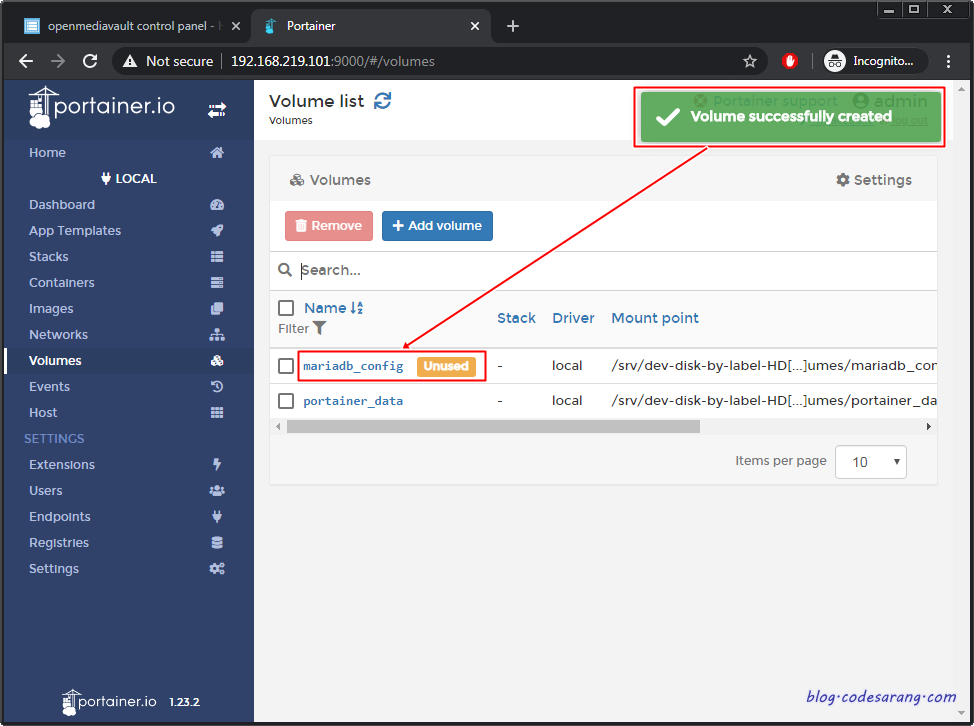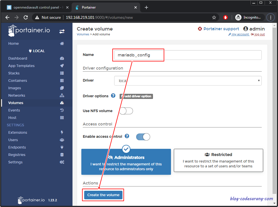 "mariadb_config" 혹은 다른 이름을 입력하고 "Create the volume" 버튼을 클릭한다.