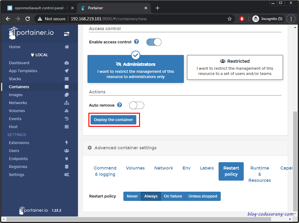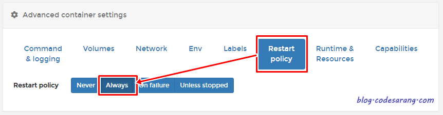 "Restart policy" 탭을 클릭하여, 자동실행 정책을 "Always"로 선택한다.
