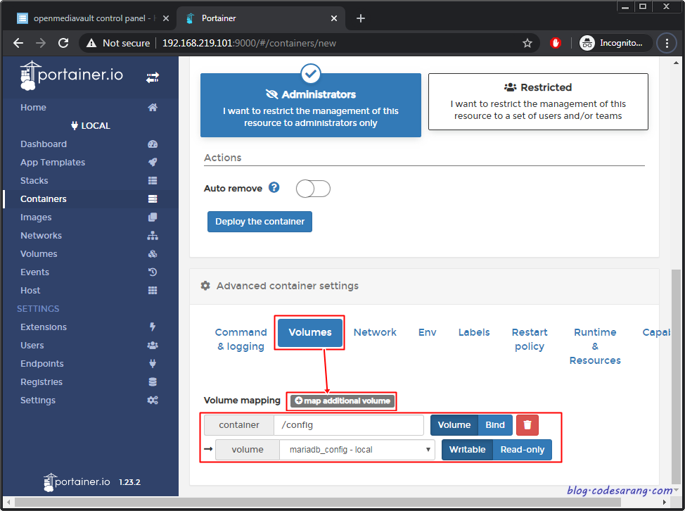 아래쪽으로 스크롤하여 "Advanced container settings" 부분의 "Volumes" 탭을 선택한다. "map addtional volume" 버튼을 클릭해 "/config" 폴더를 아까 생성한 "mariadb_config" 볼륨으로 매핑해준다.