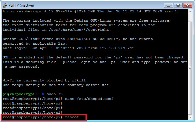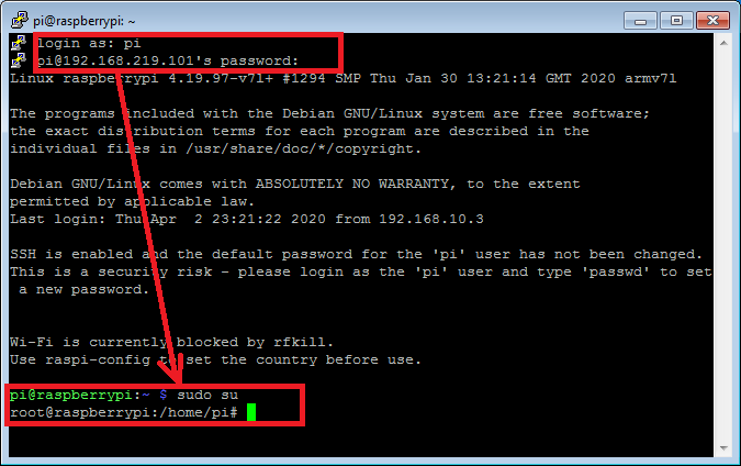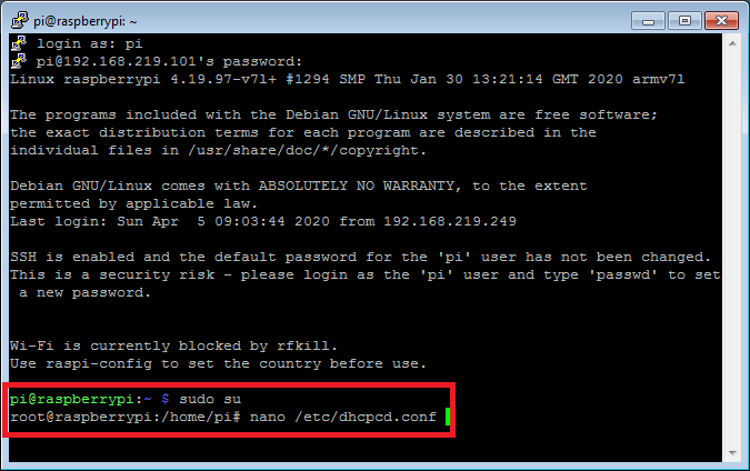 따라서, 라즈베리파이를 지속적으로 관리 및 운용하기 위해서는 고정 IP 주소로 할당하는 것이 편리하다. IP 주소 설정을 변경하기 위해서는 관리자 권한이 필요하다. 위에서 SSH로 raspbian에 접속 후 "sudo su" 명령을 이용하여 관리자 권한으로 변경한다.