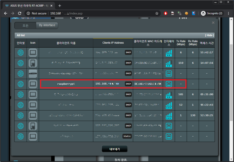 나는 모니터 없이 본체만으로 라즈베리파이를 셋팅한 상태이다. 이 상황에서 라즈베리파이의 접속 IP를 확인하기 위해서는 공유기의 클라이언트 정보를 확인하면 된다.